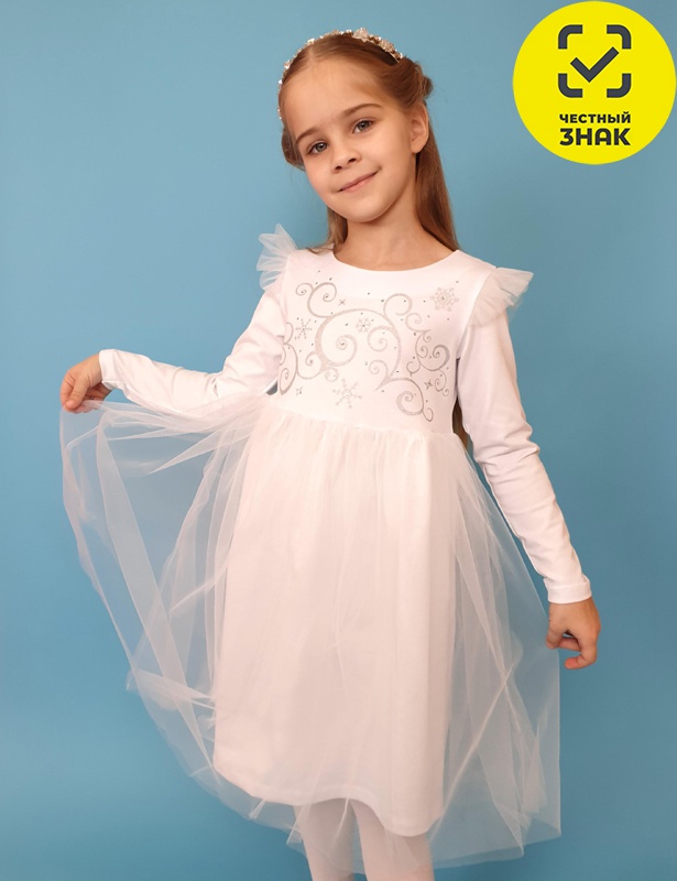 Платье силуэта трапеция, втачной длинный рукав с отделочным элементом из сетки. Отрезная юбка с сеткой (100% пэ), горловина обработана обтачкой. Печать на полочке со стразами. Застежка по спинке на 1 пуговицу.