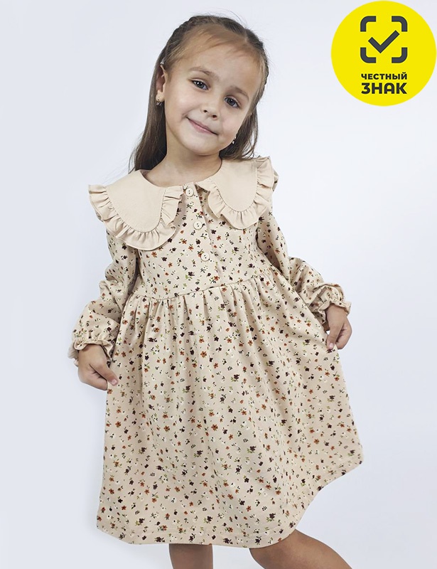 Платье для девочки полуприлегающего силуэта, длинный рукав с резинкой внизу, сборка по окату. Отрезная юбка в сборку. В горловине плосколежащий воротник с рюшей, застежка центральная на пуговицы.