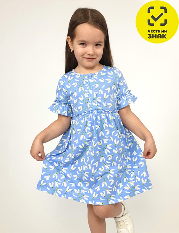 Платье для девочки - силуэт трапеция, перед и спинка с кокеткой, юбка со сборкой. Рукав короткий с рюшей. Застежка по переду, на пуговицы. Горловина окантована.