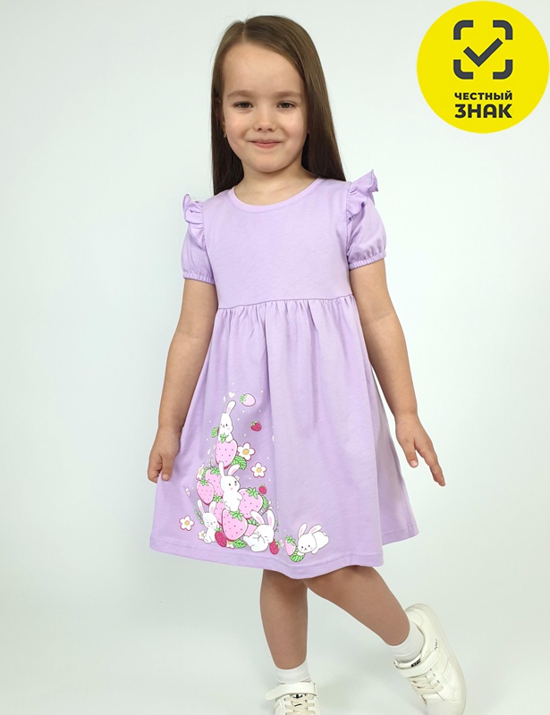Платье для девочки - перед и спинка с кокеткой, сборка по верху юбки. Рукав короткий, внизу собран на резинку, в пройме рюша. Горловина обработана ластиком. Печать на переднем полотнище юбки.