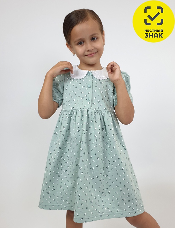 Платье для девочки с отрезной юбкой в сборку. Короткий рукав с резинкой внизу, сборка по окату. Горловина окантована и подшита. Вышитый отделочный воротник, настрочен на окантовку. Застежка центральная на пуговицы.