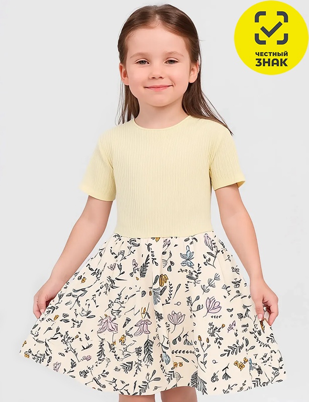 Платье для девочки, короткий втачной рукав, отрезное по линии талии, верх из гладкокрашеного полотна лапша, юбка из набивного полотна.