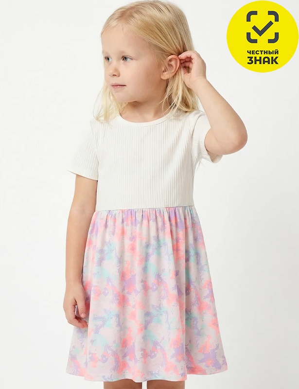 Платье для девочки, короткий втачной рукав, отрезное по линии талии, верх из гладкокрашеного полотна лапша, юбка из набивного полотна.