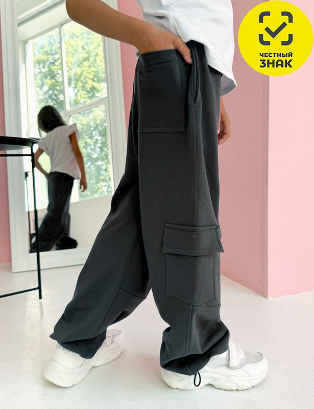 Модные брюки-карго, с накладным карманом , подойдут в качестве повседневной одежды. Свободный силуэт и пояс на завязках не стесняют движений. Внизу затяжки, которые позволяют создать любую длину и фасон брюк. Сзади карман.