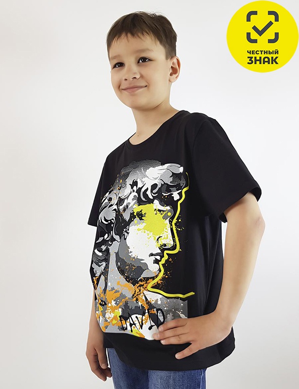 Футболка прямого силуэта, перед с печатью, рукав втачной короткий. Горловина обработана ластиком. Низ изделия и рукава подшиты.