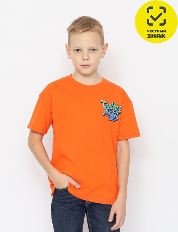 Футболка оверсайз для мальчика из кулирной глади. Рукав втачной, горловина обработана притачной бейкой из рибаны с лайкрой. Перед и спинка декорирован принтом "Нарушитель спокойствия".