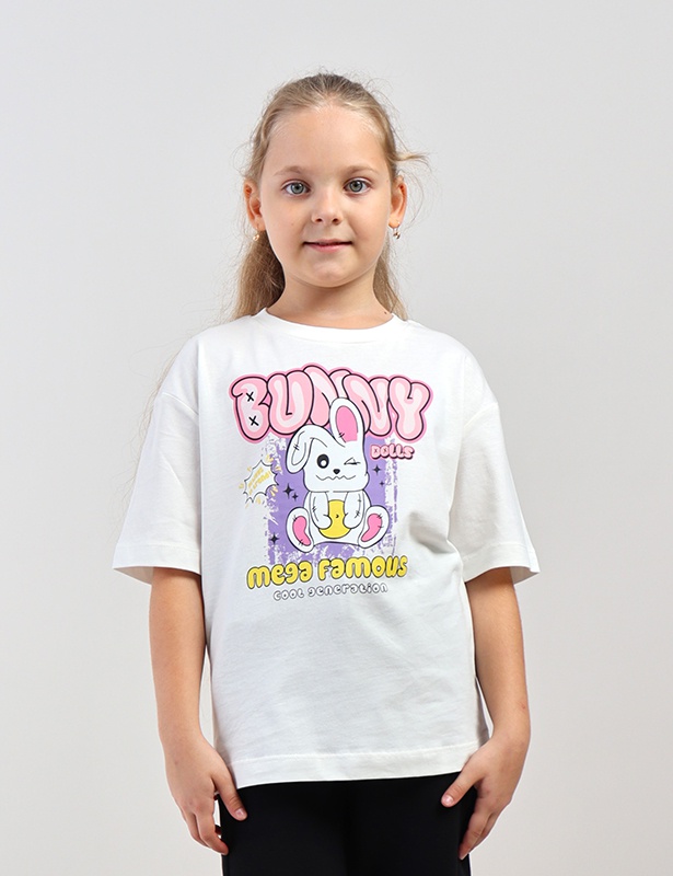 Трикотажная футболка оверсайз для девочки, из мягкого хлопкового трикотажа. Свободный силуэт со спущенной линией плеч. Модель с круглым вырезом горловины и короткими рукавами. Горловина оформлена бейкой из рибаны. Декорирована трендовым принтом, в стиле граффити спереди, надпись: Мега знаменитая. Всегда в тренде.