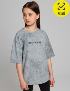 Футболка для девочки из хлопкового полотна «кулирка-варенка» с удлиненными плечевыми швами, втачными короткими рукавами, горловиной овальной формы, обработанной втачной планкой, и принтом на передней детали, выполненным в технике шелкографии. По горловине изделия настрочена отделочная строчка.