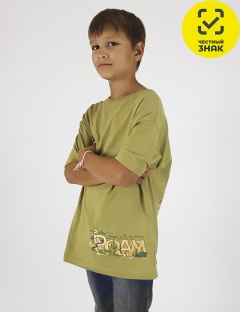 Футболка для мальчика (оверсайз), прямой силуэт спущенное плечо, короткий рукав, перед и спинка с печатью. Горловина обработана планкой из ластика. Низ изделия и рукава подшиты.