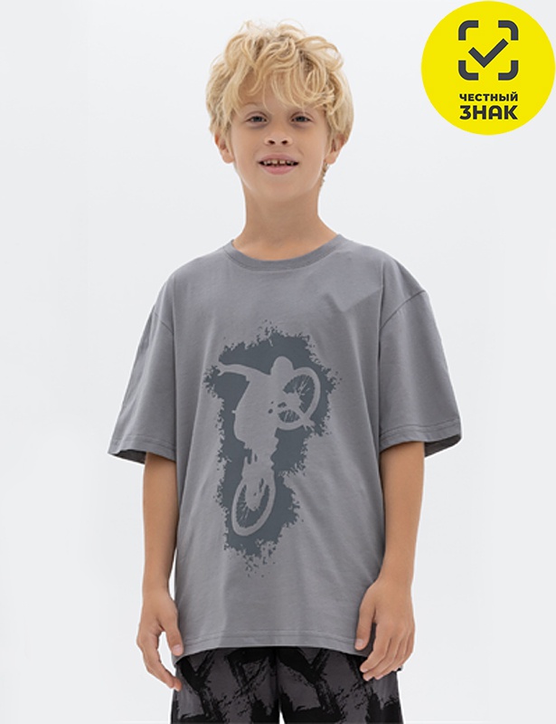 Футболка для мальчика: оверсайз из кулирной глади. Рукав втачной, линия плеча приспущена, горловина обработана притачной бейкой из рибаны с лайкрой. Перед декорирован принтом.