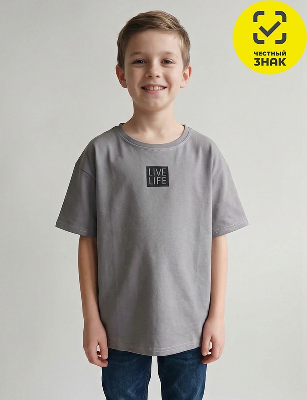 Футболка с высоким содержанием хлопка для мальчиков. Модель свободного кроя с принтом на груди.