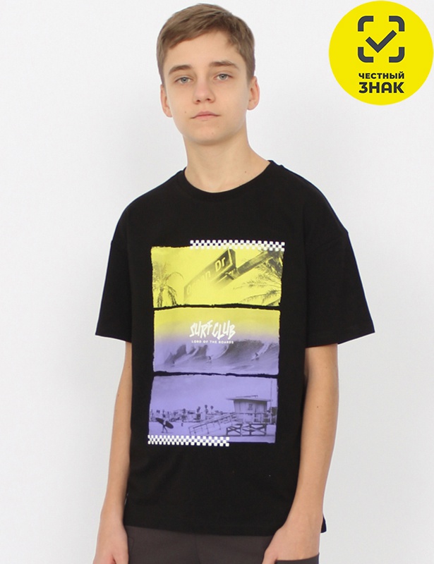 Футболка для мальчика свободного покроя. Рукав втачной, горловина обработана притачной бейкой из рибаны с лайкрой. Перед декорирован принтом.