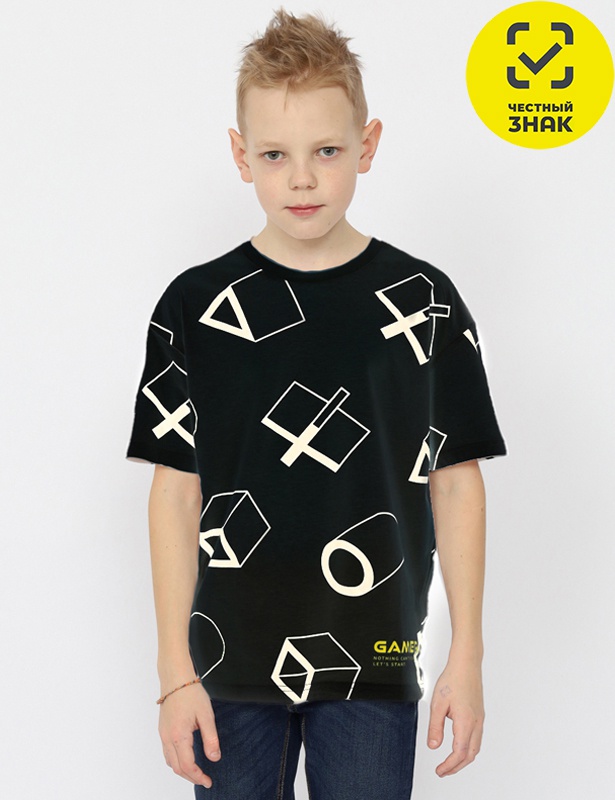 Футболка для мальчика с коротким рукавом из полотна с набивкой. Горловина обработана притачной бейкой из рибаны с лайкрой. Перед декорирован принтом.