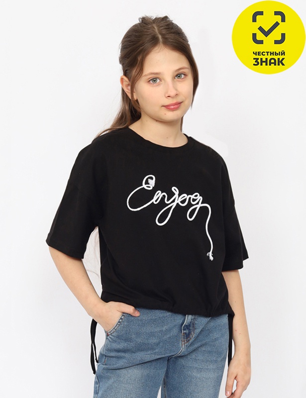 Футболка с трендовой вышивкой шнуром выполнена из натурального хлопка. Свободный крой oversize трендовый силуэт, круглый вырез горловины, короткие рукава со спущенной линией плеча, снизу функциональная кулиска.