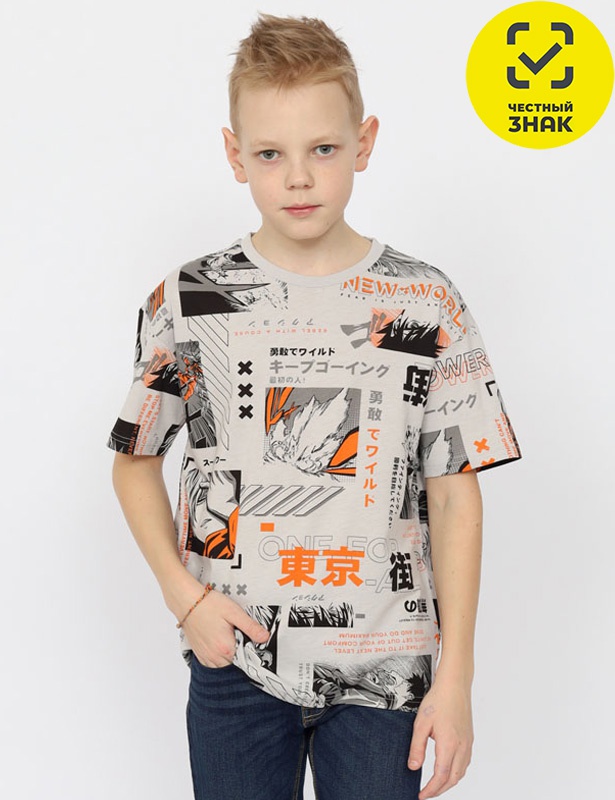 Футболка для мальчика с коротким рукавом из полотна с набивкой. Горловина обработана притачной бейкой из рибаны с лайкрой.