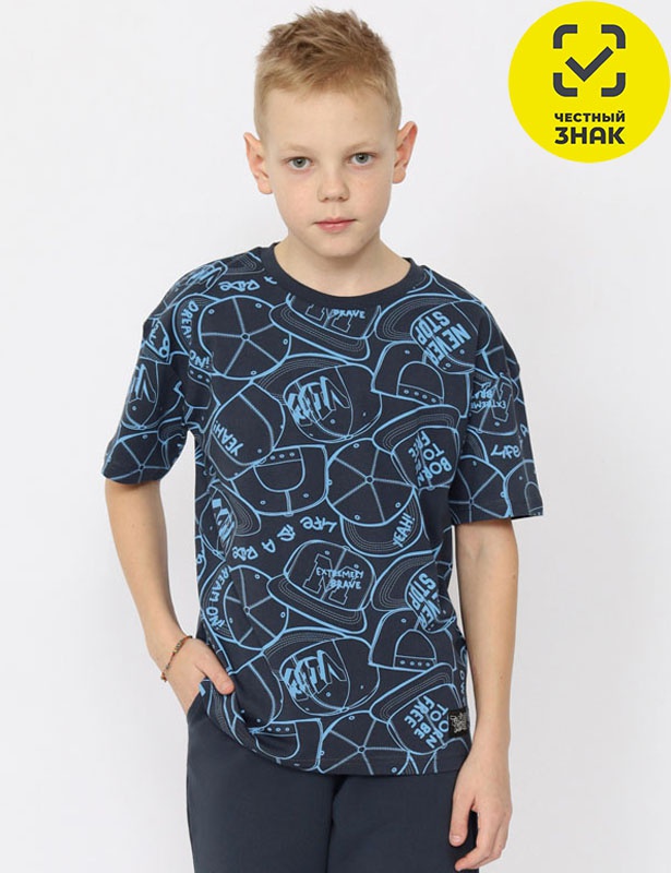 Футболка для мальчика из набивной кулирной глади. Рукав втачной, горловина обработана притачной бейкой из рибаны с лайкрой.