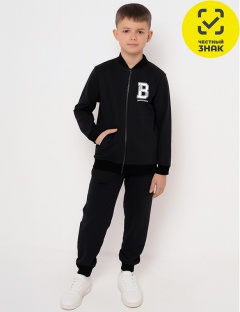 Костюм из футера петли двунитки для мальчика. Куртка с длинными рукавами на манжетах, карманом "кенгуру", на полочке минималистичный принт. Брюки с боковыми карманами, на притачном поясе с отстроченной эластичной тесьмой, зауженные к низу на манжет.