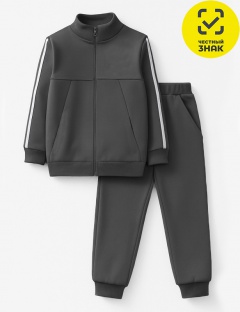 Костюм спортивный для мальчика состоит из двух предметов: куртки и брюк. Куртка с воротником стойка, застёгивается на молнию. Рукава длинные, втачные, с манжетами, декорированы контрастной вставкой. Брюки прямые, с карманами, на манжетах.