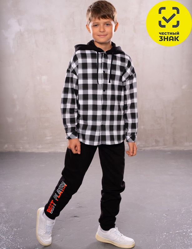 Костюм для мальчика из двухниточного футера с начесом. Рубашка с капюшоном, длинными рукавами, центральной застежкой на кнопки. Брюки по талии на резинке и кулиске, с двумя боковыми карманами, к низу зауженные на манжет, декорированы принтом.