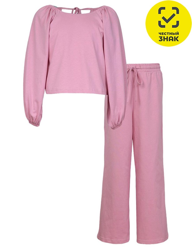 Комплект для девочки (джемпер+ брюки). Джемпер-прямой, рукав реглан, длинный, внизу на резинке. Горловина по переду и спинке подшита, в области плеча собрана на резинку. На спинке вырез завязан на бант. Брюки-длинные, свободные на поясе с резинкой и шнуром.
