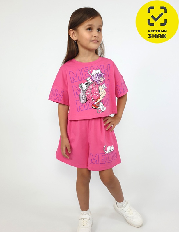 Комплект для девочки. Футболка (оверсайз) укороченная, спущенное плечо, короткий рукав с печатью. Печать на переде, горловина обработана планкой. Шорты короткие, складки спереди, два боковых кармана, пояс на резинке. Печать на левой половинке внизу.