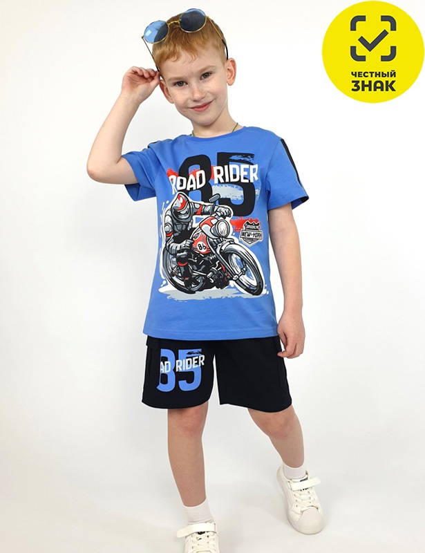 Комплект для мальчика (футболка+шорты). Футболка-прямая, короткий втачной рукав, перед и рукава с печатью. Горловина обработана ластиком. Шорты - удлиненные, притачной пояс с резинкой. Два накладных кармана с клапаном сбоку. Печать на правой передней половинке шорт внизу.