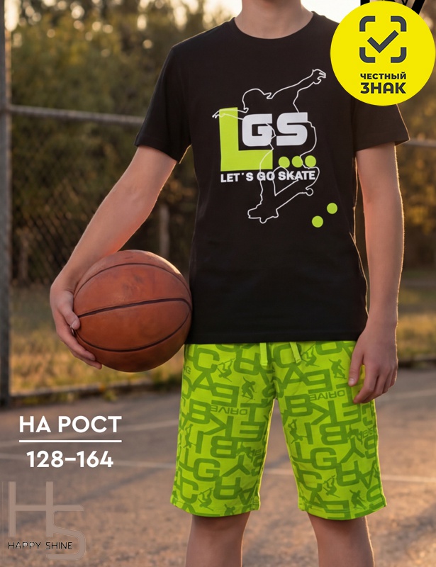 Комплект для мальчика включает футболку и шорты. Футболка классического кроя, с коротким втачным рукавом, горловиной, обработанной притачной бейкой, спереди декорирована принтом. Шорты изготовлены из кулирной глади повышенной плотности, верх шорт обработан притачным поясом из основного полотна и эластичной резинкой внутри, в пояс вставлен функциональный шнурок.
