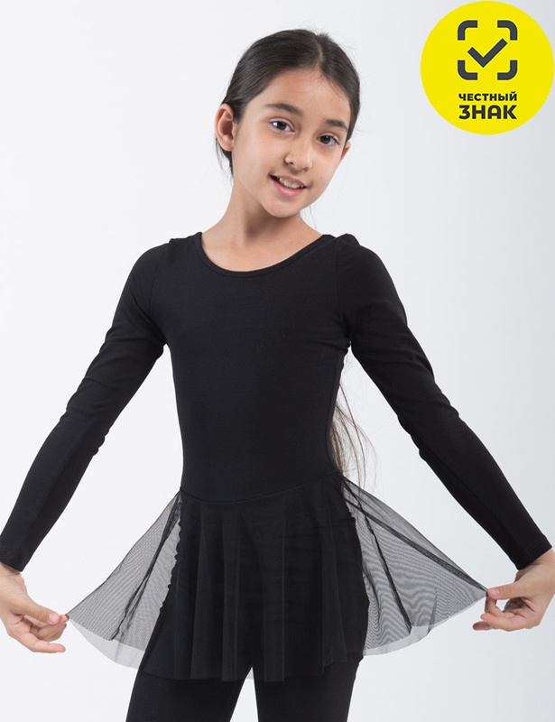 Купальник с длинным рукавом и юбкой из мягкой сетки. Срезы горловины и пройм ножек окантованы бейкой из основного полотна.