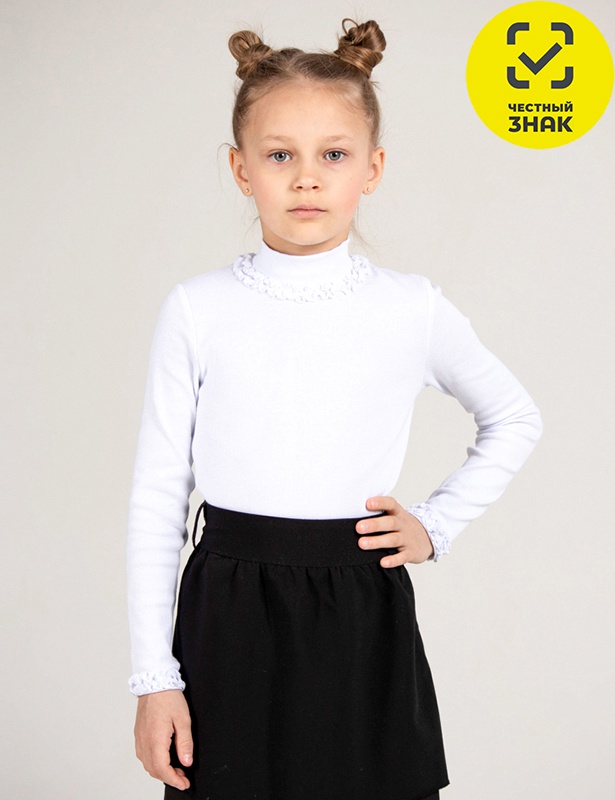 Водолазка из кашкорсе с эластаном. Модель с длинными рукавами и воротником-стойкой. По шву притачивания воротника и шву подшивки низа рукава эластичной строчкой настрочены рюши из основного полотна. Края рюши обработаны микрооверлоком.
