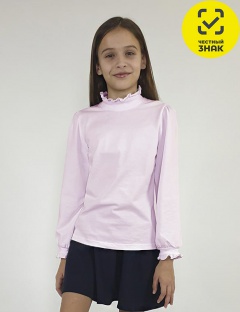 Джемпер прямого силуэта, длинный рукав со сборкой по окату и внизу, на манжете с рюшей. В горловине стойка с рюшей, застежка "капелька" на спинке с пуговицей.
