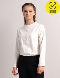 Джемпер свободного силуэта для девочки со спущенным плечом и длинными рукавами. Полочка декорированя кружевом. Воротник из основного полотна.