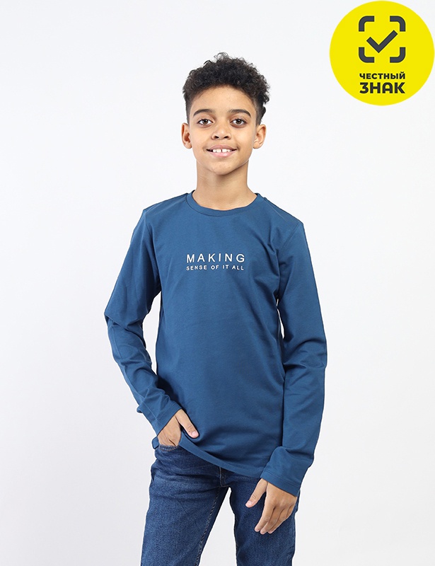 Джемпер изготовлен из кулирной глади повышенной плотности. Рукав втачной, длинный. Воротник выполнен из материала с добавлением эластана. Рукава декорированы принтом.