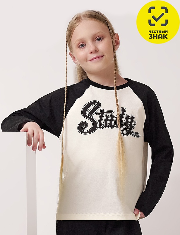 Стильный лонгслив из хлопкового трикотажа- то, что нужно для твоего классного лука! Покрой рукава реглан, контрастная горловина и рукава, стильный дизайнерский принт- всё для твоего отличного настроения!