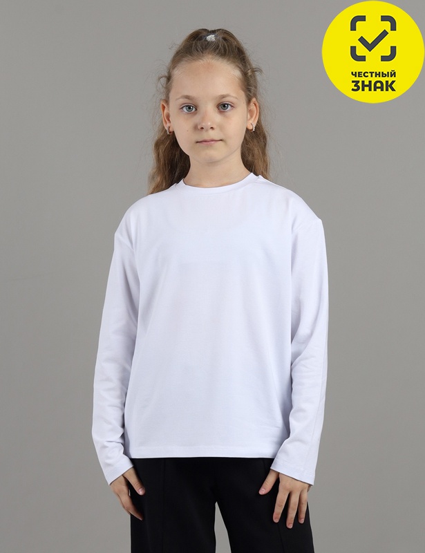 жемпер свободного силуэта для девочки со спущенным плечом и длинными рукавами. Воротник из основного полотна. На спинке декоративная жаккардовая этикетка.