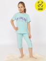 Гладкокрашенная пижама из футболки и бридж. Футболка свободного покроя с коротким рукавом. Горловина обработана притачной бейкой из рибаны с лайкрой. Перед оформлен принтом. Бриджи прямые умеренного объёма длиной ниже колена. Цельнокроенный пояс обработан плоским швом вподгибку с одновременным прокладыванием резинки. На левой стороне выполнен принт.