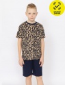 Пижама комбинированная из футболки и шорт. Футболка гладкокрашенная, свободного покроя с коротким рукавом. Горловина обработана притачной бейкой из рибаны с лайкрой. Перед оформлен принтом. Шорты свободного покроя длиной ниже колена выполнены из набивного полотна. Цельнокроенный пояс обработан плоским швом вподгибку с одновременным прокладыванием резинки.