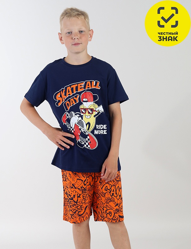 Комплект для мальчика. Футболка свободного силуэта с круглым воротником из эластичной рибаны и втачным рукавом. Перед декорирован принтом. Шорты набивные, свободные, длиной выше колена.