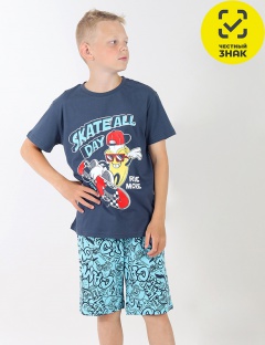 Комплект для мальчика. Футболка свободного силуэта с круглым воротником из эластичной рибаны и втачным рукавом. Перед декорирован принтом. Шорты набивные, свободные, длиной выше колена.