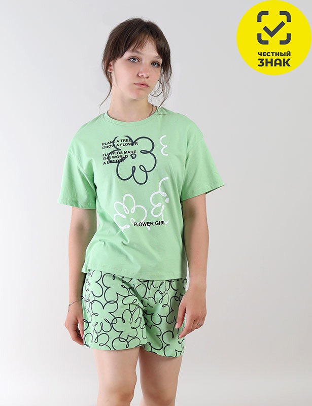 Пижама комбинированная из гладкокрашеной футболки и набивных шорт. Футболка оверсайз с коротким рукавом. Горловина обработана притачной бейкой из рибаны с лайкрой. Перед оформлен принтом. Шорты свободного покроя длиной до середины бедра. Цельнокроеный пояс обработан плоским швом вподгибку с одновременным прокладыванием резинки.