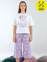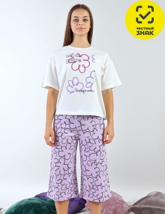 Пижама комбинированная из гладкокрашеной футболки и набивных бридж. Футболка оверсайз с коротким рукавом. Горловина обработана притачной бейкой из рибаны с лайкрой. Перед оформлен принтом. Бриджи свободного покроя длиной до середины икры, расклешённые к низу. Цельнокроеный пояс обработан плоским швом вподгибку с одновременным прокладыванием резинки.