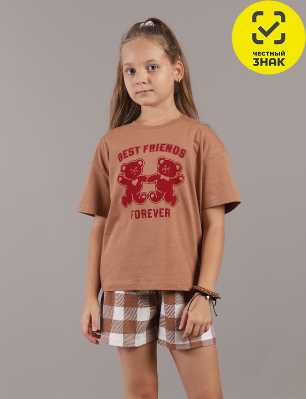 Пижама для девочки: футболка и шорты из мягкого трикотажа. Футболка с коротким рукавом, горловина круглая, на полочке печать. Шорты с поясом на резинке с кулиской в тон футболки.