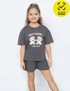 Пижама для девочки: футболка и шорты из мягкого трикотажа. Футболка с коротким рукавом, горловина круглая, на полочке печать. Шорты с поясом на резинке с кулиской в тон футболки.