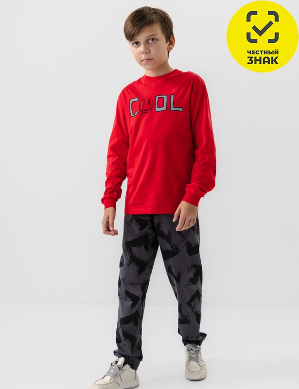 Пижама для мальчика: джемпер и брюки из мягкого трикотажа. Джемпер гладкокрашенный с длинным рукавом на манжете из рибаны. Горловина круглая, из рибаны, на полочке принт в виде надписи - "круто". Брюки из полотна в набивку "абстракция" с поясом на резинке и манжетами по низу из рибаны.