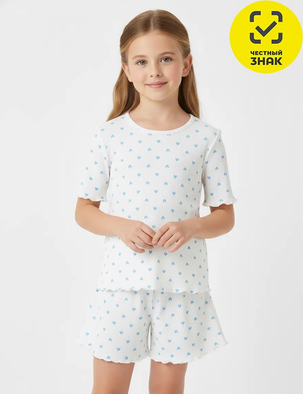 Пижама для девочки, включает футболку с коротким рукавом и шорты. Выполнена из мягкой хлопковой ткани с текстурой лапша.