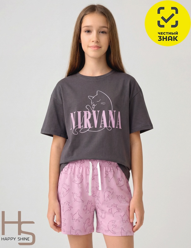 Пижама для девочки: футболка и шорты из мягкого трикотажа. Футболка с коротким рукавом, горловина круглая, на полочке печать. Шорты с поясом на резинке.