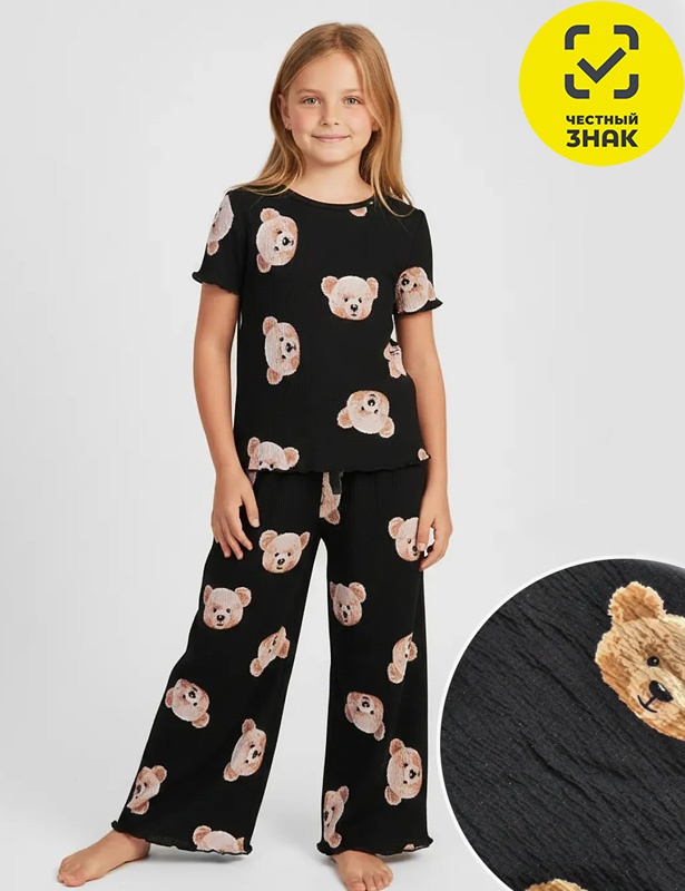 Комплект для девочки, состоит из футболки с коротким рукавом и штанов. Выполнена из мягкой хлопковой ткани с текстурой жатка.