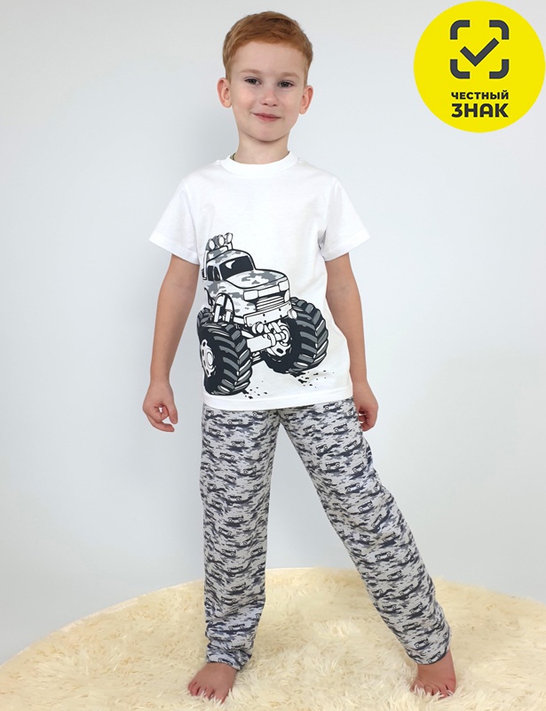 Пижама для мальчика (футболка и брюки). Футболка прямая, рукав втачной, короткий. Горловина обработана ластиком. Печать на переде. Брюки(пижамные)-длинные, прямые. Верхний срез подшит с резинкой.