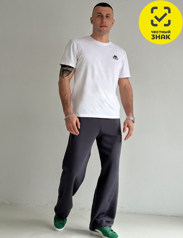Брюки мужские из футера трехнитки, без начеса. Пояс на резинке с функциональным шнуром, нижние срезы собраны на шнурок затяжку.