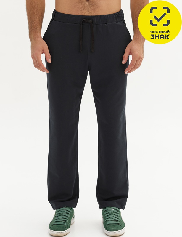 Брюки мужские: из мягкого гладкокрашеного трикотажа. Брюки прямые с карманами, с поясом на резинке.