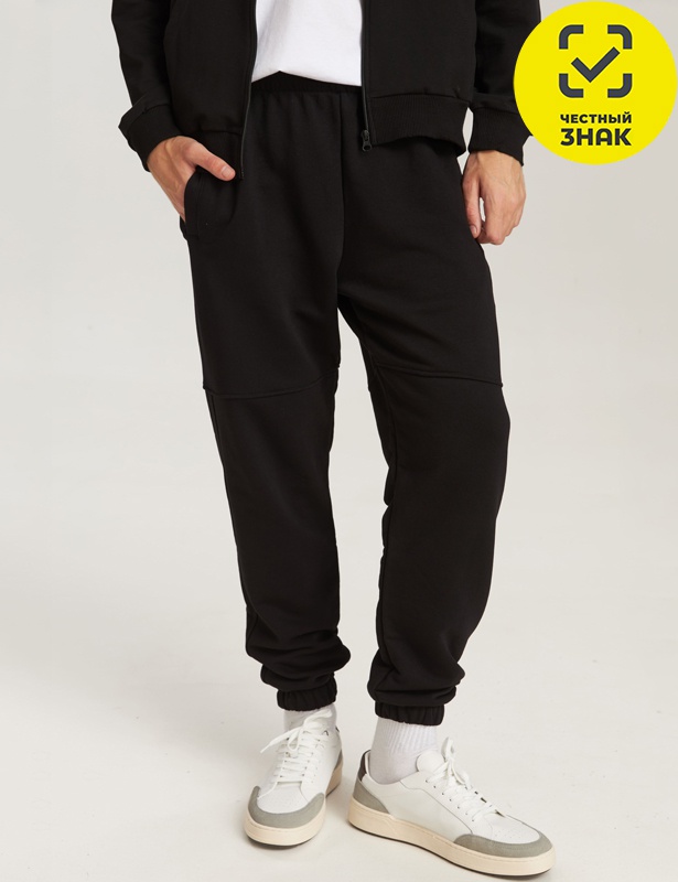 Спортивные штаны зауженного кроя с эластичным поясом на кулиске с функциональным шнуром внутри и декоративными швами на коленях. Модель выполнена из плотного трикотажа, обеспечивающего комфорт и свободу движений. Низ брюк слегка заужен, что создает современный силуэт.